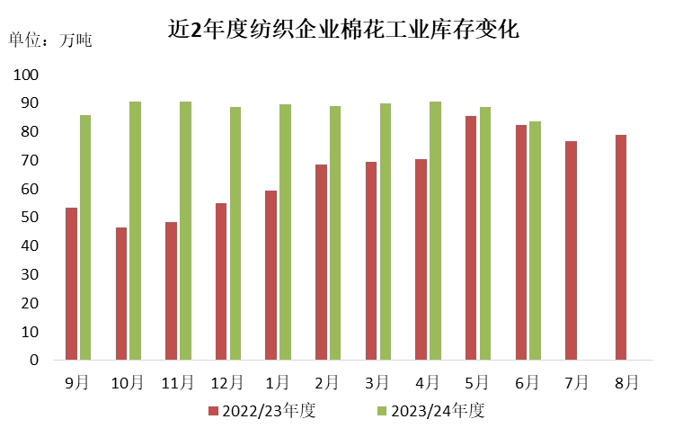 2、紡織企業(yè)使用地產(chǎn)棉比重為8.4%,環(huán)比增加0.4個(gè)百分點(diǎn)。其中:儲(chǔ)備地產(chǎn)棉占比為7.7%,2023/24年度地產(chǎn)棉占比為90.3%。