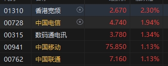 電訊服務板塊漲勢活躍,中國電信漲近2%。消息面上,摩根大通研報指出,重申對內地三大電信股“增持”評級。該行看好中移動收益率達7%及股息年均復合增長率達7%;在波動市場中的防御性高;相對于中電信及聯(lián)通,中移動股價跑輸,具追落后潛力。該行預期內地電信股第二季收入疲弱但盈利穩(wěn)健。