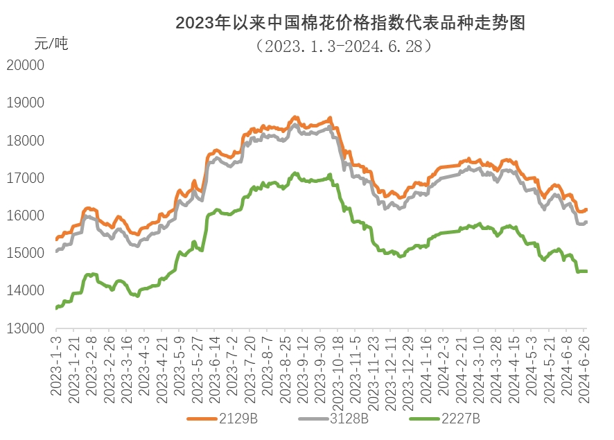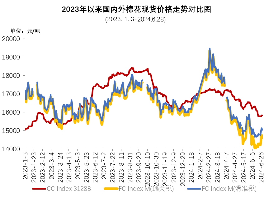 6月,國(guó)內(nèi)棉花市場(chǎng)供應(yīng)充足,紡織下游淡季氛圍濃厚,新增訂單嚴(yán)重不足,成品銷售不暢,庫(kù)存持續(xù)累積,棉紗價(jià)格下跌且走貨緩慢,庫(kù)存及資金壓力上升,原料補(bǔ)庫(kù)以逢低適量采買為主。下游需求持續(xù)不振,中國(guó)棉花價(jià)格指數(shù)震蕩下行,月下旬跌至15772元/噸,再次刷新本年度新低。同期,國(guó)際棉價(jià)月初下跌,主要受美聯(lián)儲(chǔ)維持利率不變、USDA月度報(bào)告上調(diào)產(chǎn)量等因素影響,且跌幅大于國(guó)內(nèi),內(nèi)外棉價(jià)差一度擴(kuò)大至2000元/噸左右;月度后期隨著能源、谷物市場(chǎng)上漲,國(guó)際棉價(jià)有所回升,內(nèi)外棉現(xiàn)貨價(jià)差有所縮小。