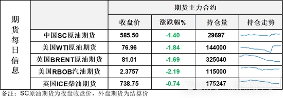 【1】WTI主力原油期貨收跌1.44美元,跌幅1.84%,報76.96美元/桶;布倫特主力原油期貨收跌1.39美元,跌幅1.69%,報81.01美元/桶;INE原油期貨收跌1.4%,報585.5元。