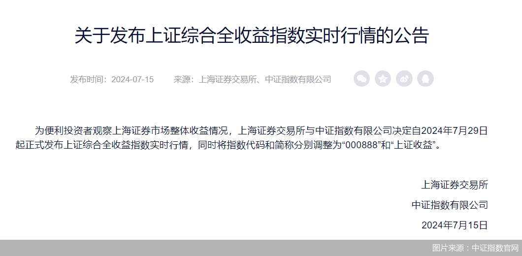 近日,據(jù)中證指數(shù)有限公司公告,為便利投資者觀察上海證券市場(chǎng)整體收益情況,中證指數(shù)有限公司與上交所決定自7月29日起正式發(fā)布上證收益實(shí)時(shí)行情。