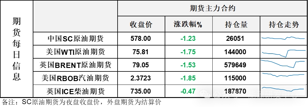 【1】WTI主力原油期貨收跌1.35美元,跌幅1.75%,報(bào)75.81美元/桶;布倫特主力原油期貨收跌1.23美元,跌幅1.53%,報(bào)79.05美元/桶;INE原油期貨收跌1.23%,報(bào)578元。