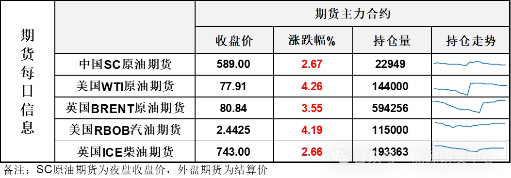 【1】WTI主力原油期貨收漲3.18美元,漲幅4.26%,報77.91美元/桶;布倫特主力原油期貨收漲2.77美元,漲幅3.55%,報80.84美元/桶;INE原油期貨收漲2.67%,報589元。