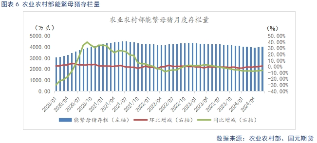 根據(jù)農(nóng)業(yè)農(nóng)村部數(shù)據(jù)顯示,2024年6月末全國(guó)能繁母豬存欄量4038萬頭,同比下降6%,環(huán)比上漲1.1%。相當(dāng)于正常保有量的103.5%,處于綠色區(qū)域。下半年產(chǎn)能去化效果逐步顯現(xiàn),對(duì)豬價(jià)下方形成較穩(wěn)固的支撐。不過隨著我國(guó)生豬行業(yè)生產(chǎn)效率提升以及豬肉消費(fèi)需求等變化,3月1日農(nóng)業(yè)農(nóng)村部新修正的《生豬產(chǎn)能調(diào)控實(shí)施方案》發(fā)布,提出將能繁母豬正常保有量從4100萬頭下調(diào)至3900萬頭,以此來看,當(dāng)前存欄基數(shù)的實(shí)際產(chǎn)能比預(yù)期偏大,豬價(jià)上行幅度不宜過高估計(jì)。