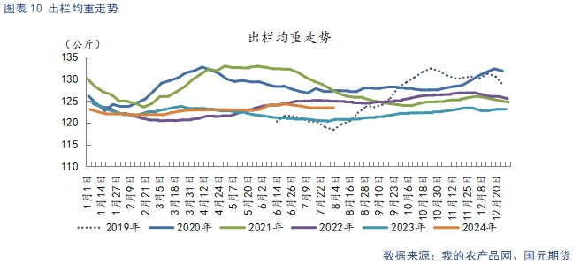 截止8月2日,生豬出欄均重123.4公斤,與上月環(huán)比上調(diào)0.02公斤??礉q情緒下,養(yǎng)殖端壓欄、二育增多。大豬供應(yīng)偏緊,標(biāo)肥價(jià)差倒掛,前期壓欄、二育的大體重豬出欄積極性較強(qiáng),出欄均重預(yù)期延續(xù)小幅上調(diào)。