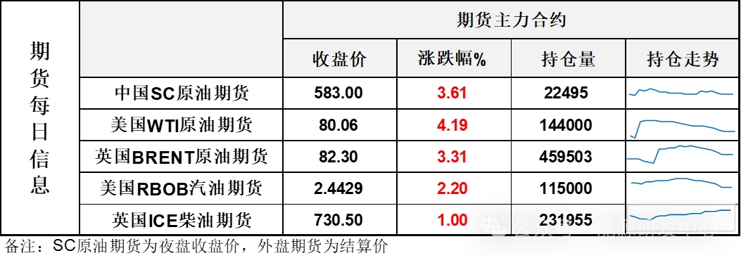 【1】WTI主力原油期貨收漲3.22美元,漲幅4.19%,報(bào)80.06美元/桶;布倫特主力原油期貨收漲2.64美元,漲幅3.31%,報(bào)82.3美元/桶;INE原油期貨收漲3.61%,報(bào)583元。