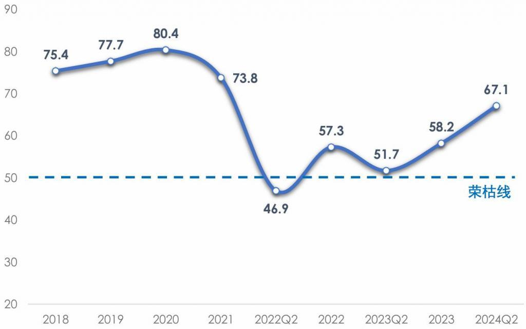 2024年上半年,外部環(huán)境復(fù)雜性嚴(yán)峻性不確定性明顯上升、國內(nèi)結(jié)構(gòu)調(diào)整持續(xù)深化等帶來新挑戰(zhàn),但宏觀政策效應(yīng)持續(xù)釋放、外需有所回暖、新質(zhì)生產(chǎn)力加速發(fā)展等因素也形成新支撐。我國產(chǎn)業(yè)用紡織品行業(yè)的市場需求總體回暖,新冠肺炎疫情帶來的需求大幅波動的影響已經(jīng)基本消退,行業(yè)工業(yè)增加值增速自2023年年初以來重回上升通道,但部分應(yīng)用領(lǐng)域需求的不確定性和各類潛在風(fēng)險影響著行業(yè)當(dāng)前的發(fā)展和對未來的預(yù)期。根據(jù)協(xié)會調(diào)研,2024年上半年我國產(chǎn)業(yè)用紡織品行業(yè)景氣指數(shù)為67.1,較2023年同期(51.7)顯著回升(圖1)。