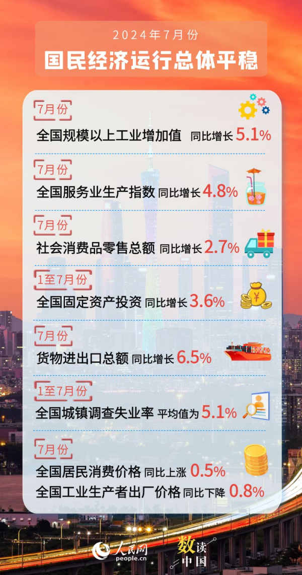 國家統(tǒng)計(jì)局15日公布多項(xiàng)宏觀經(jīng)濟(jì)數(shù)據(jù)顯示,7月份,我國經(jīng)濟(jì)運(yùn)行總體平穩(wěn)、穩(wěn)中有進(jìn),生產(chǎn)需求繼續(xù)恢復(fù),就業(yè)物價(jià)總體穩(wěn)定,新動(dòng)能繼續(xù)培育壯大,高質(zhì)量發(fā)展扎實(shí)推進(jìn)。