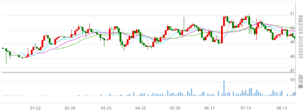 今日(2024年08月21日,周三)中國繭絲綢交易市場生絲電子指數(shù)微跌0.16%報4981.63點。B絲2022D(商檢4A級生絲):240825合約報平收于50.58萬元;240925合約上漲0.03萬元報收于49.89萬元;250325合約下跌0.09萬元報收于49.44萬元。