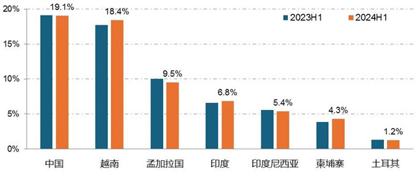 美國(guó)商務(wù)部紡織品服裝辦公室(OTEXA)數(shù)據(jù)顯示,上半年美國(guó)自全球進(jìn)口紡織品服裝金額共計(jì)493.5億美元,同比減少3.6%,其中自我國(guó)進(jìn)口金額為111.3億美元,同比減少1.6%,我國(guó)在美進(jìn)口市場(chǎng)占比為22.6%,較上年同期提高0.5個(gè)百分點(diǎn)。主要進(jìn)口來(lái)源國(guó)中,自越南、印度、巴基斯坦、土耳其進(jìn)口紡織品服裝所占市場(chǎng)份額均較上年同期有所提升,上半年美國(guó)自上述國(guó)家進(jìn)口紡織品服裝金額分別為72億美元、48億美元、18.4億美元和12.1億美元,在美進(jìn)口市場(chǎng)份額分別為14.6%、9.7%、3.7%和2.5%,較上年同期分別提高0.4、0.6、0.1和0.1個(gè)百分點(diǎn)。但自孟加拉國(guó)、印度尼西亞紡織品服裝進(jìn)口所占市場(chǎng)份額有所下滑,上半年孟加拉國(guó)在美進(jìn)口市場(chǎng)份額下降0.6個(gè)百分點(diǎn)至7.1%,印度尼西亞在美進(jìn)口市場(chǎng)份額下降0.2個(gè)百分點(diǎn)至4.5%。