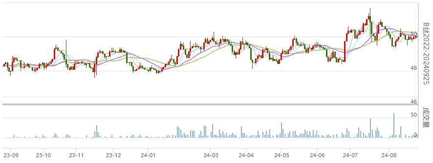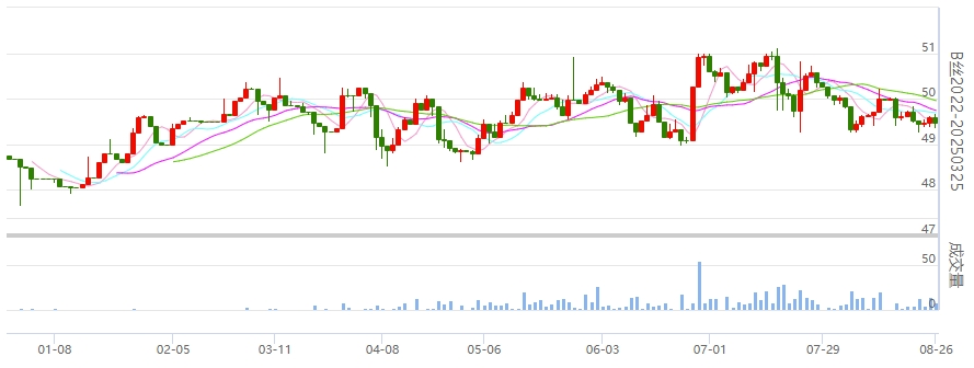 今日(2024年08月26日,周一)中國繭絲綢交易市場生絲電子指數報收于4954.10點。B絲2022D(商檢4A級生絲):240925合約下跌0.03萬元報收于50.01萬元;250325合約下跌0.12萬元報收于49.47萬元。