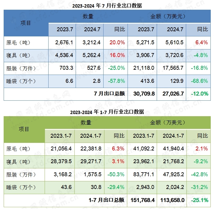 2024年7月,行業(yè)出口總額約2.7億美元,同比下降12.0%,較上月降幅繼續(xù)縮窄約10個百分點。原毛和寢具出口量繼續(xù)保持增長,其中原毛出口量3212.4噸,同比增長20.0%,出口額5610.5萬美元,同比增長6.4%;寢具出口量5262.4噸,同比增長16.0%,出口額3720.6萬美元,同比下滑4.8%。服裝出口繼續(xù)下跌,出口量與去年同期減少175.7萬件,降幅25.0%,出口額同比下滑16.8%。
