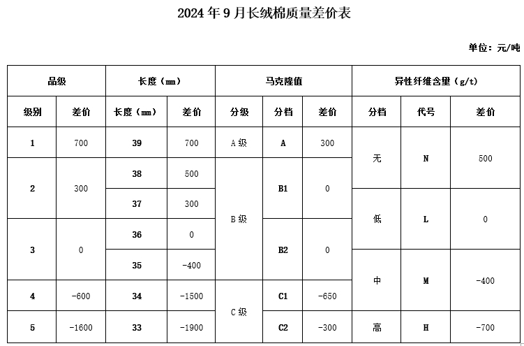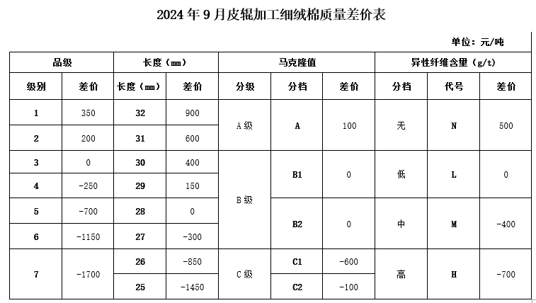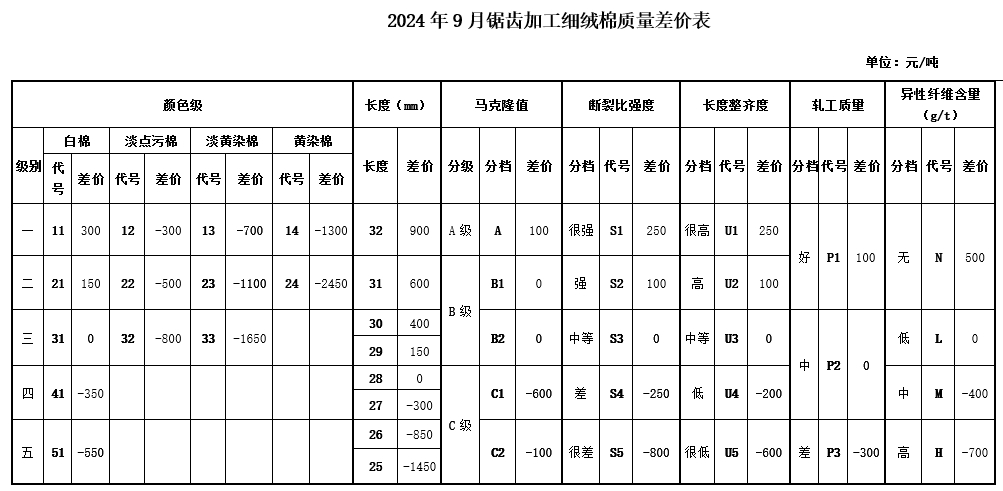 根據(jù)《中國棉花協(xié)會國產(chǎn)棉質(zhì)量差價表管理辦法》規(guī)定,現(xiàn)正式發(fā)布2024年9月《鋸齒加工細(xì)絨棉質(zhì)量差價表》、《皮輥加工細(xì)絨棉質(zhì)量差價表》和《長絨棉質(zhì)量差價表》(單位:元/噸)。