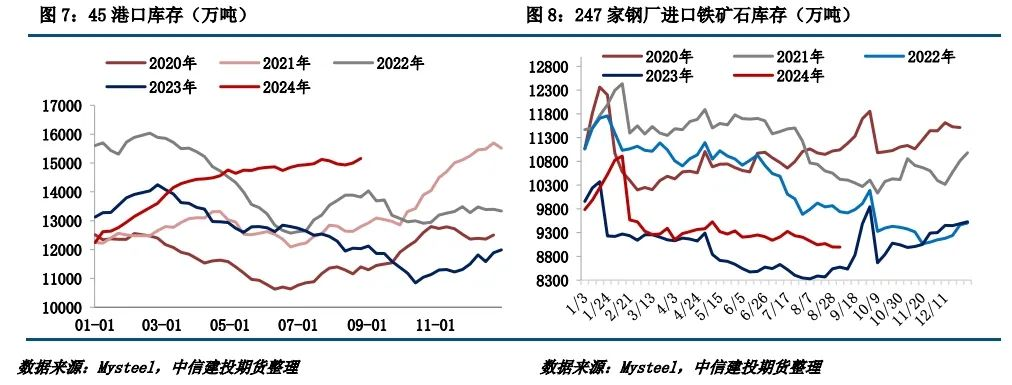 (1)港口庫存:本期45港鐵礦石庫存重回累庫通道。中國45港鐵礦石庫存止降轉(zhuǎn)增,絕對值處于近3年同期高位。截止8月29日,45港鐵礦石庫存總量15372.4萬噸,環(huán)比累庫339.9萬噸,較年初累庫3127.6萬噸,比去年同期庫存高3245.6萬噸。9月份中國45港鐵礦石庫存或?qū)⒀永m(xù)累庫趨勢。