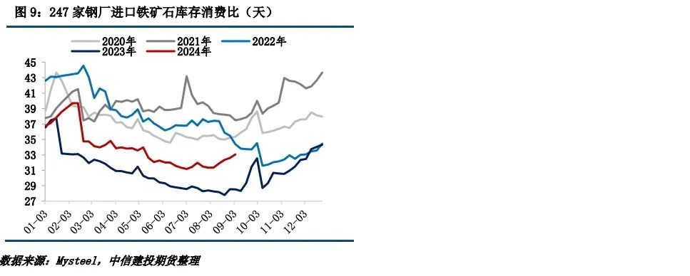 (2)鋼廠庫存:鋼廠進口礦庫存繼續(xù)降低。據(jù)Mysteel統(tǒng)計數(shù)據(jù),截止8月30日,247家鋼廠進口鐵礦石庫存總量為8996.47萬噸,環(huán)比減少3.59萬噸,高于去年同期;從相對量來看,當(dāng)前樣本鋼廠的進口礦日耗為272.18萬噸,環(huán)比減少3.90萬噸,庫存消費比33.05,環(huán)比增加0.45天。