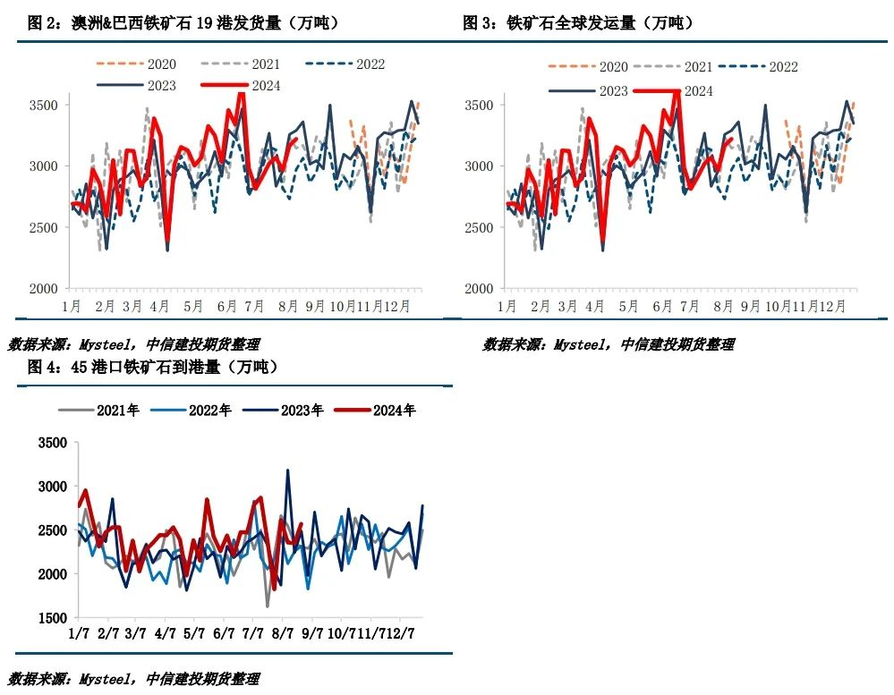 (2)鐵礦石到港量近端供給:8月份45港到港總量環(huán)比減少,仍處于近三年同期高位。預(yù)計絕對值為10903萬噸,環(huán)比減少3萬噸;8月日均到港351.7萬噸,環(huán)比減少0.1萬噸。根據(jù)Mysteel數(shù)據(jù),本期中國45港到港總量為2567萬噸,周環(huán)比增加219.1萬噸,較上月周均值高104萬噸;8月到港量周均值為2470萬噸,環(huán)比7月增加7.3萬噸,同比去年8月增加27萬噸。根據(jù)前期發(fā)運量及季節(jié)性推算,預(yù)計9月供應(yīng)格局較8月寬松。