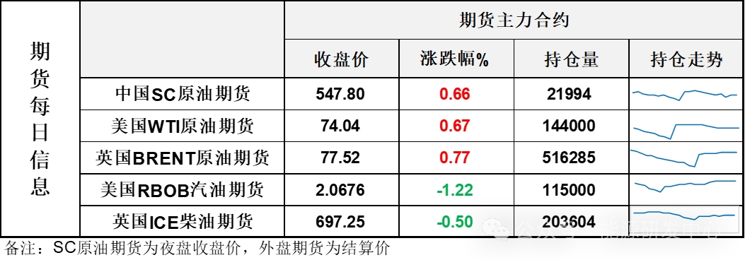 【1】WTI因假期提前休市,主力原油期貨漲0.49美元,漲幅0.67%,報74.04美元/桶;布倫特主力原油期貨收漲0.59美元,漲幅0.77%,報77.52美元/桶;INE原油期貨收漲0.66%,報547.8元。