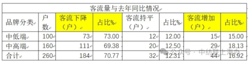 1,從客流量情況來看,走訪的商家中大部分都反饋今年的客流量與去年同比是下降的,這個比例占到70.77%。僅有16.92%的商家反饋客流量有所增加。在去年的調(diào)查中,我們得到的信息是當(dāng)時客流有所恢復(fù),但還沒有恢復(fù)到疫情前,這主要是因為當(dāng)時疫情管控剛放開,客流比疫情管控中增加是正?,F(xiàn)象。但就目前的情況來看,現(xiàn)在商場中光顧實體服裝店的人氣已更不如從前,且已經(jīng)形成一種趨勢。