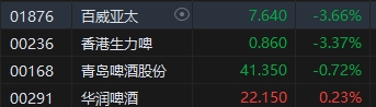 啤酒股逆勢(shì)走低,百威亞太跌超3%。2024年1-7月,中國規(guī)模以上企業(yè)累計(jì)啤酒產(chǎn)量2267.4萬千升,同比下降1.6%。企業(yè)端的增長放緩在去年亦有所表現(xiàn)。進(jìn)入2024年,啤酒巨頭們?cè)鏊俜啪徃用黠@。上半年重慶啤酒、燕京啤酒以及珠江啤酒三家國產(chǎn)巨頭均錄得個(gè)位數(shù)增長,除了百威亞太營收、凈利雙減外,華潤啤酒(22.15, 0.05, 0.23%)營收還出現(xiàn)了自2020年以來的首次下滑。