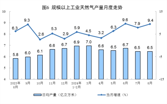 天然氣生產加快。8月份,規(guī)上工業(yè)天然氣產量200億立方米,同比增長9.4%,增速比7月份加快1.5個百分點;日均產量6.5億立方米。進口天然氣1176萬噸,同比增長9.1%。