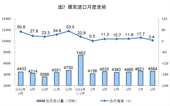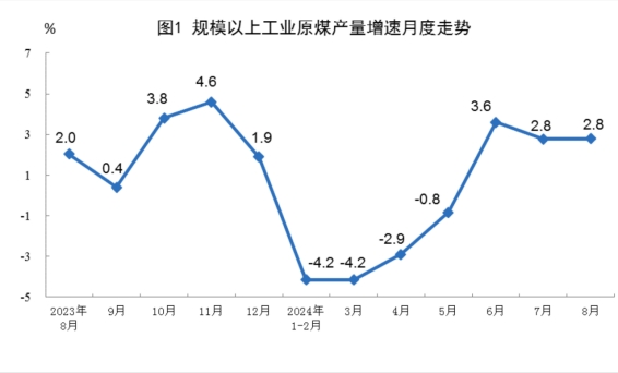 原煤生產平穩(wěn)增長。8月份,規(guī)上工業(yè)原煤產量4.0億噸,同比增長2.8%,增速與7月份持平;日均產量1279.2萬噸。進口煤炭4584萬噸,同比增長3.4%。