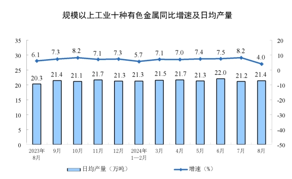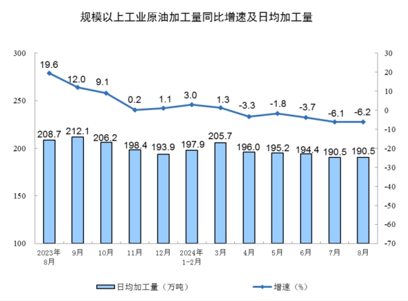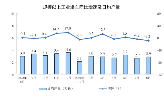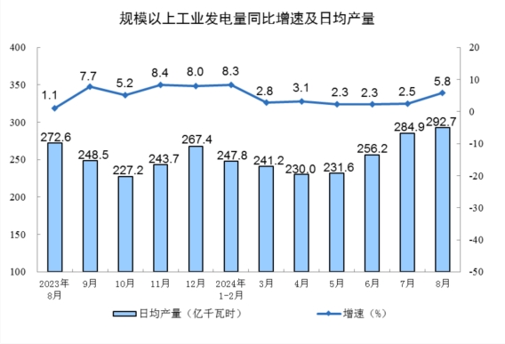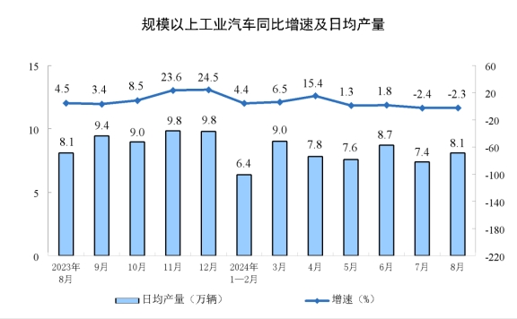 分產(chǎn)品看,8月份,規(guī)模以上工業(yè)619種產(chǎn)品中有339種產(chǎn)品產(chǎn)量同比增長(zhǎng)。其中,鋼材11090萬(wàn)噸,同比下降6.5%;水泥15763萬(wàn)噸,下降11.9%;十種有色金屬662萬(wàn)噸,增長(zhǎng)4.0%;乙烯274萬(wàn)噸,下降1.5%;汽車251.1萬(wàn)輛,下降2.3%,其中新能源汽車110.5萬(wàn)輛,增長(zhǎng)30.5%;發(fā)電量9074億千瓦時(shí),增長(zhǎng)5.8%;原油加工量5907萬(wàn)噸,下降6.2%。