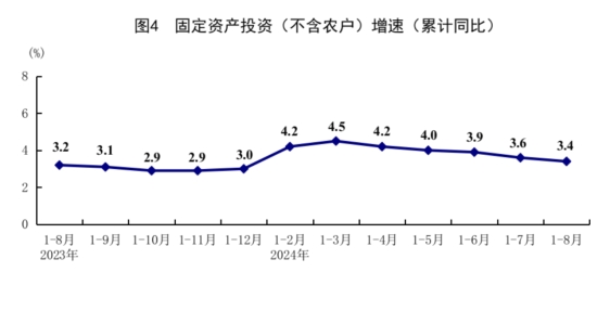1-8月份,全國固定資產(chǎn)投資(不含農(nóng)戶)329385億元,同比增長3.4%;扣除房地產(chǎn)開發(fā)投資,全國固定資產(chǎn)投資增長7.7%。分領(lǐng)域看,基礎(chǔ)設(shè)施投資同比增長4.4%,制造業(yè)投資增長9.1%,房地產(chǎn)開發(fā)投資下降10.2%。全國新建商品房銷售面積60602萬平方米,同比下降18.0%;新建商品房銷售額59723億元,下降23.6%。分產(chǎn)業(yè)看,第一產(chǎn)業(yè)投資同比增長2.9%,第二產(chǎn)業(yè)投資增長12.1%,第三產(chǎn)業(yè)投資下降0.8%。民間投資同比下降0.2%;扣除房地產(chǎn)開發(fā)投資,民間投資增長6.3%。高技術(shù)產(chǎn)業(yè)投資同比增長10.2%,其中高技術(shù)制造業(yè)和高技術(shù)服務(wù)業(yè)投資分別增長9.6%、11.7%。高技術(shù)制造業(yè)中,航空、航天器及設(shè)備制造業(yè),電子及通信設(shè)備制造業(yè)投資分別增長34.4%、10.0%;高技術(shù)服務(wù)業(yè)中,專業(yè)技術(shù)服務(wù)業(yè)、電子商務(wù)服務(wù)業(yè)投資分別增長27.7%、16.8%。8月份,固定資產(chǎn)投資(不含農(nóng)戶)環(huán)比增長0.16%。
