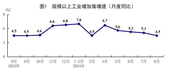 8月份,全國規(guī)模以上工業(yè)增加值同比增長4.5%;環(huán)比增長0.32%。分三大門類看,采礦業(yè)增加值同比增長3.7%,制造業(yè)增長4.3%,電力、熱力、燃?xì)饧八a(chǎn)和供應(yīng)業(yè)增長6.8%。裝備制造業(yè)增加值同比增長6.4%,高技術(shù)制造業(yè)增加值增長8.6%,分別快于全部規(guī)模以上工業(yè)增加值1.9和4.1個(gè)百分點(diǎn)。分經(jīng)濟(jì)類型看,國有控股企業(yè)增加值同比增長3.6%;股份制企業(yè)增長5.0%,外商及港澳臺(tái)投資企業(yè)增長2.8%;私營企業(yè)增長4.5%。分產(chǎn)品看,新能源汽車、服務(wù)機(jī)器人、集成電路產(chǎn)品產(chǎn)量同比分別增長30.5%、20.1%、17.8%。1-8月份,全國規(guī)模以上工業(yè)增加值同比增長5.8%。8月份,制造業(yè)采購經(jīng)理指數(shù)為49.1%,企業(yè)生產(chǎn)經(jīng)營活動(dòng)預(yù)期指數(shù)為52.0%。1-7月份,全國規(guī)模以上工業(yè)企業(yè)實(shí)現(xiàn)利潤總額40992億元,同比增長3.6%。