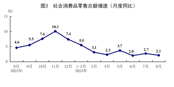 8月份,社會(huì)消費(fèi)品零售總額38726億元,同比增長2.1%;環(huán)比下降0.01%。按經(jīng)營單位所在地分,城鎮(zhèn)消費(fèi)品零售額33575億元,同比增長1.8%;鄉(xiāng)村消費(fèi)品零售額5151億元,增長3.9%。按消費(fèi)類型分,商品零售額34375億元,增長1.9%;餐飲收入4351億元,增長3.3%。部分基本生活類和升級(jí)類商品銷售較好,限額以上單位糧油、食品類,中西藥品類商品零售額分別增長10.1%、4.3%,通訊器材類、家用電器和音像器材類商品零售額分別增長14.8%、3.4%。1-8月份,社會(huì)消費(fèi)品零售總額312452億元,同比增長3.4%。全國網(wǎng)上零售額96352億元,同比增長8.9%。其中,實(shí)物商品網(wǎng)上零售額80143億元,增長8.1%,占社會(huì)消費(fèi)品零售總額的比重為25.6%。1-8月份,服務(wù)零售額同比增長6.9%。