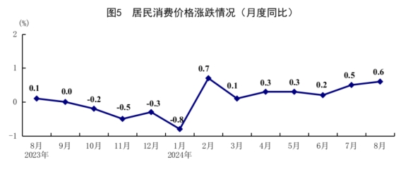 8月份,全國居民消費(fèi)價(jià)格(CPI)同比上漲0.6%,漲幅比上月擴(kuò)大0.1個(gè)百分點(diǎn);環(huán)比上漲0.4%。分類別看,食品煙酒價(jià)格同比上漲2.1%,衣著價(jià)格上漲1.4%,居住價(jià)格同比持平,生活用品及服務(wù)價(jià)格上漲0.2%,交通通信價(jià)格下降2.7%,教育文化娛樂價(jià)格上漲1.3%,醫(yī)療保健價(jià)格上漲1.3%,其他用品及服務(wù)價(jià)格上漲3.4%。在食品煙酒價(jià)格中,糧食價(jià)格下降0.1%,鮮果價(jià)格上漲4.1%,豬肉價(jià)格上漲16.1%,鮮菜價(jià)格上漲21.8%。扣除食品和能源價(jià)格后的核心CPI同比上漲0.3%。1-8月份,全國居民消費(fèi)價(jià)格同比上漲0.2%。