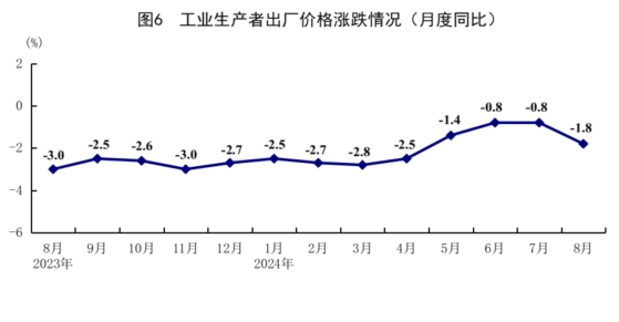 8月份,全國工業(yè)生產(chǎn)者出廠價(jià)格同比下降1.8%,環(huán)比下降0.7%;全國工業(yè)生產(chǎn)者購進(jìn)價(jià)格同比下降0.8%,環(huán)比下降0.6%。1-8月份,全國工業(yè)生產(chǎn)者出廠價(jià)格和購進(jìn)價(jià)格同比分別下降1.9%和2.1%。