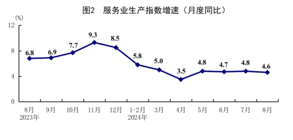 8月份,全國服務(wù)業(yè)生產(chǎn)指數(shù)同比增長4.6%。分行業(yè)看,信息傳輸、軟件和信息技術(shù)服務(wù)業(yè),租賃和商務(wù)服務(wù)業(yè),金融業(yè),交通運(yùn)輸、倉儲(chǔ)和郵政業(yè)生產(chǎn)指數(shù)同比分別增長12.1%、9.4%、5.7%、5.2%,分別快于服務(wù)業(yè)生產(chǎn)指數(shù)7.5、4.8、1.1、0.6個(gè)百分點(diǎn)。1-8月份,全國服務(wù)業(yè)生產(chǎn)指數(shù)同比增長4.9%。1-7月份,規(guī)模以上服務(wù)業(yè)企業(yè)營業(yè)收入同比增長7.4%。8月份,服務(wù)業(yè)商務(wù)活動(dòng)指數(shù)為50.2%,服務(wù)業(yè)業(yè)務(wù)活動(dòng)預(yù)期指數(shù)為55.4%。其中,鐵路運(yùn)輸、航空運(yùn)輸、郵政、電信廣播電視及衛(wèi)星傳輸服務(wù)、文化體育娛樂等行業(yè)商務(wù)活動(dòng)指數(shù)位于55.0%以上較高景氣區(qū)間。