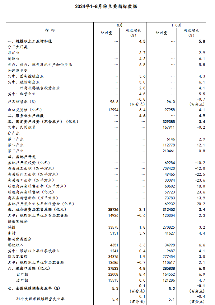 2024年1-8月份主要指標(biāo)數(shù)據(jù)
