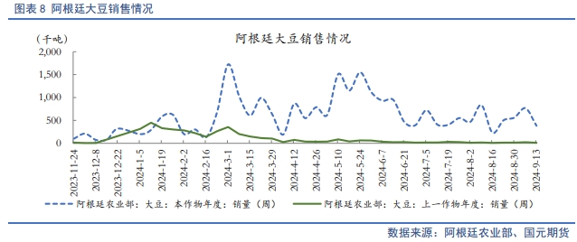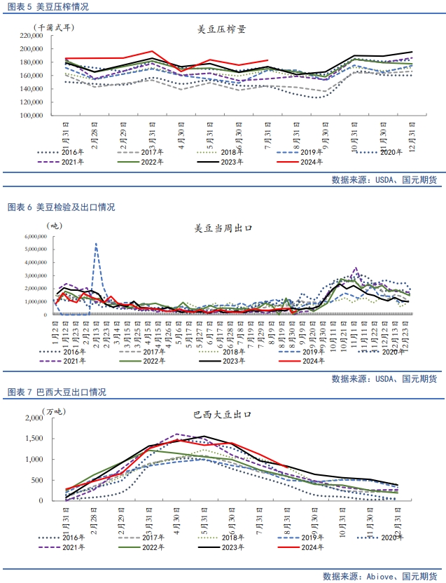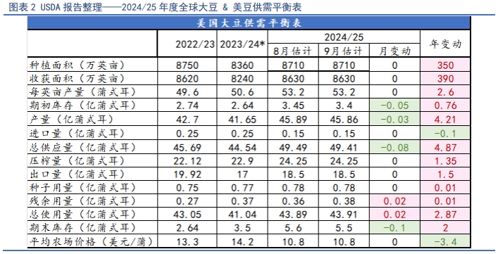9月12日,美國農(nóng)業(yè)部發(fā)布9月份供需報告,維持2024/25年度美國大豆收獲面積、單產(chǎn)基本不變,產(chǎn)量略微下調(diào)300萬蒲式耳(約9萬噸)至45.86億蒲式耳(合1.248億噸),期末庫存下調(diào)1000萬蒲式耳至5.5億蒲式耳(合1497萬噸)。另外,報告維持美豆農(nóng)場年度均價預(yù)估不變,仍為10.80美元/蒲式耳。南美來看,美國農(nóng)業(yè)部9月份供需報告維持2024/25年度巴西、阿根廷大豆產(chǎn)量預(yù)估不變,仍為1.69億噸和5100萬噸,將巴拉圭大豆產(chǎn)量上調(diào)50萬噸至1120萬噸,作為對比,2023/24年度三國大豆產(chǎn)量分別調(diào)整為1.53億噸、4810萬噸和1100萬噸。將2024/25年度全球大豆產(chǎn)量上調(diào)47萬噸至4.29億噸,期末庫存上調(diào)28萬噸至1.35億噸。