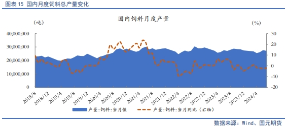 據(jù)中國工業(yè)飼料協(xié)會數(shù)據(jù)顯示,2024年7月,全國工業(yè)飼料產(chǎn)量2650萬噸,環(huán)比增長3.5%,同比下降4.4%。主要配合飼料、濃縮飼料產(chǎn)品出廠價格環(huán)比、同比均呈下降趨勢,添加劑預(yù)混合飼料產(chǎn)品出廠價格同比小幅下降。飼料企業(yè)生產(chǎn)的配合飼料中玉米(2388, 9.00, 0.38%)用量占比為29.8%,同比增長2.4個百分點(diǎn);配合飼料和濃縮飼料中豆粕用量占比為12.4%,同比下降1.4個百分點(diǎn)。