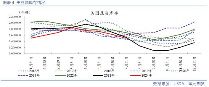 美國全國油籽加工商協(xié)會(NOPA)月度壓榨報告顯示,8月份NOPA會員的大豆壓榨量為1.58億蒲,為2021年9月以來的最低值,環(huán)比減少13.6%,同比減少2.1%。美國大豆在9月份開始收獲,許多加工廠在收獲前閑置設(shè)施,因此8月份通常是每年壓榨量最低的月份。8月底NOPA成員的豆油(7630, 36.00, 0.47%)庫存為11.38億磅,較7月底的14.99億磅減少24.1%,創(chuàng)下去年11月以來最低庫存,比2023年8月底的12.5億磅減少9.0%。