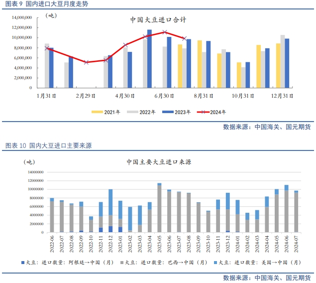 海關(guān)數(shù)據(jù)顯示,2024年8月份我國進(jìn)口大豆1214.4萬噸,同比增加278.1萬噸或29.7%,為歷史最高單月進(jìn)口量。1-8月我國累計(jì)進(jìn)口大豆7048萬噸,同比增加192萬噸或2.8%。1-8月進(jìn)口大豆平均成本(包含稅費(fèi),不含港雜)4076元/噸,較去年同期的4800元/噸下降15.1%。進(jìn)口成本大幅下降主要是因?yàn)槿虼蠖关S產(chǎn)、供給充裕,國際大豆出口報價持續(xù)下跌。按照市場年度來看,2023/24年度迄今(10月至8月),我國大豆進(jìn)口總量為9338萬噸,比上年同期9083萬噸增加255萬噸,增幅2.8%,月度平均進(jìn)口量為849萬噸。