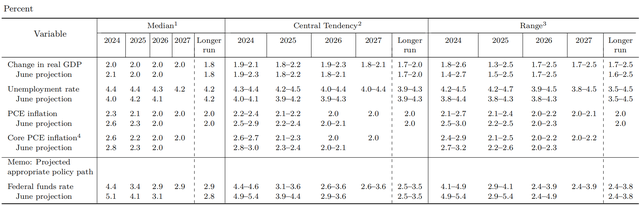 預(yù)測今年的失業(yè)率為4.4%,較6月上升0.4個(gè)百分點(diǎn);預(yù)測今年P(guān)CE(個(gè)人消費(fèi)支出)通脹為2.3%(6月預(yù)測值2.6%),2025年將回落至2.1%(6月預(yù)測值2.3%);預(yù)測今年核心PCE通脹為2.6%(6月預(yù)測值2.8%),2025年將回落至2.2%(3月預(yù)測值2.3%)。
