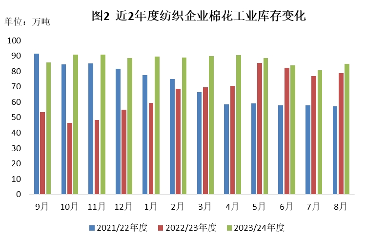 8月棉價(jià)下跌,但紗廠訂單有所回暖,部分企業(yè)低位補(bǔ)庫(kù)意愿增強(qiáng),原料庫(kù)存小幅增加。截至8月31日,紡織企業(yè)在庫(kù)棉花工業(yè)庫(kù)存量為84.92萬(wàn)噸,環(huán)比增加4.22萬(wàn)噸,同比增加6.08萬(wàn)噸。其中:42%的企業(yè)增加棉花庫(kù)存,24%增加庫(kù)存,34%基本保持不變。