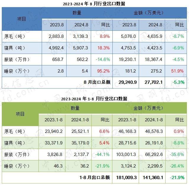 綜合1-8月來看,行業(yè)出口總額約14.1億美元,同比下滑21.9%,降幅環(huán)比1-7月繼續(xù)縮窄3.2個(gè)百分點(diǎn)。其中,原毛出口量和出口額均小幅增長(zhǎng),同比分別增長(zhǎng)6.6%和0.9%。寢具出口量同比上漲5.4%,但出口額下滑約8.8%。服裝出口下滑依然明顯,但量值的降幅較前7月有所縮窄。