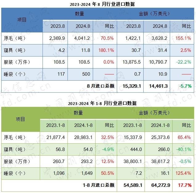 綜合1-8月來看,全行業(yè)進(jìn)口約6.4億美元,同比上漲17.7%,環(huán)比1-7月漲幅縮窄9.2個(gè)百分點(diǎn)。其中,原毛進(jìn)口量值均大幅增長(zhǎng),進(jìn)口額增幅是進(jìn)口量的2倍,服裝進(jìn)口量同比上漲12.5%,寢具進(jìn)口量同比下降4.9%。原毛和服裝進(jìn)口額占行業(yè)進(jìn)口總額約39.5%和60.1%。