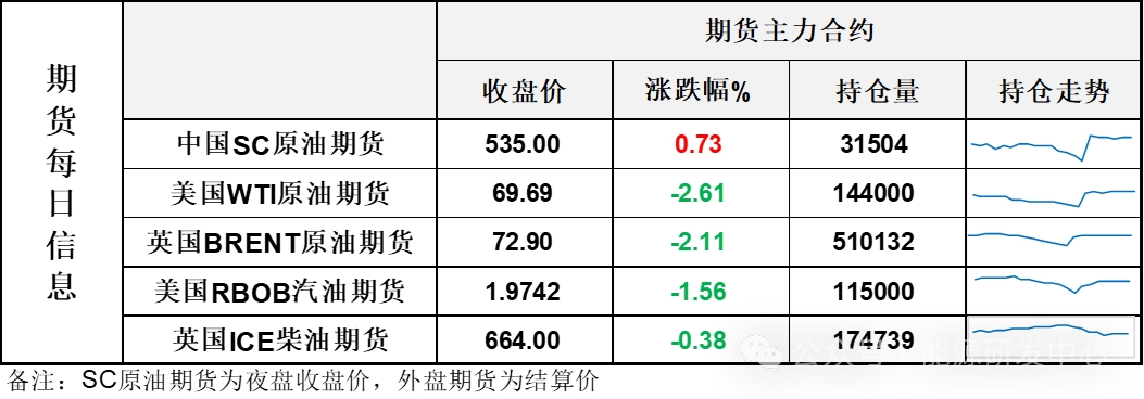 【1】WTI主力原油期貨收跌1.87美元,跌幅2.61%,報69.69美元/桶;布倫特主力原油期貨收跌1.57美元,跌幅2.11%,報72.9美元/桶;INE原油期貨收漲0.73%,報535元。