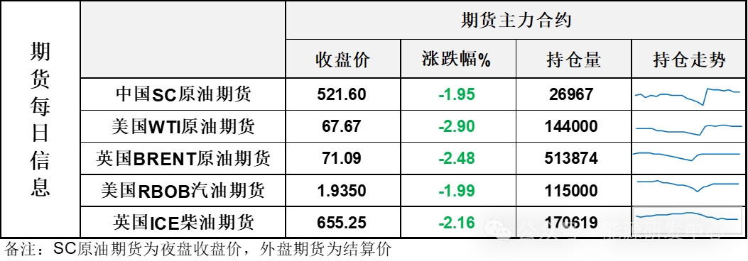 【1】WTI主力原油期貨收跌2.02美元,跌幅2.9%,報(bào)67.67美元/桶;布倫特主力原油期貨收跌1.81美元,跌幅2.48%,報(bào)71.09美元/桶;INE原油期貨收跌1.95%,報(bào)521.6元。
