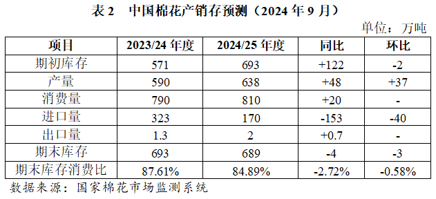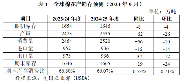 8月以來(lái)北半球主產(chǎn)國(guó)不利天氣增多,棉花產(chǎn)量和質(zhì)量預(yù)期受到影響。美國(guó)棉花產(chǎn)區(qū)干旱范圍占比一度達(dá)到43%,隨后颶風(fēng)“弗朗斯”給路易斯安那州產(chǎn)棉區(qū)帶來(lái)狂風(fēng)驟雨,不利于棉花吐絮;印度、巴基斯坦棉花產(chǎn)區(qū)也遭遇暴雨侵襲。據(jù)美國(guó)農(nóng)業(yè)部9月全球供需預(yù)測(cè),2024/25年度全球棉花產(chǎn)量2535萬(wàn)噸,環(huán)比調(diào)減26萬(wàn)噸。其中美國(guó)棉花產(chǎn)量316萬(wàn)噸,環(huán)比調(diào)減13萬(wàn)噸;印度棉花產(chǎn)量523萬(wàn)噸,環(huán)比調(diào)減11萬(wàn)噸;巴基斯坦棉花產(chǎn)量124萬(wàn)噸,環(huán)比調(diào)減7萬(wàn)噸。