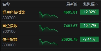 10月8日消息,今日港股三大指數(shù)大幅收跌,截至收盤,恒生指數(shù)(21101.35, -1998.43, -8.65%)跌9.41%,報20926.79點,恒生科技指數(shù)(4753.64, -632.84, -11.75%)跌12.82%,國企指數(shù)跌10.17%。盤面上,科網(wǎng)股全線下跌,嗶哩嗶哩跌超19%,美團(tuán)跌超15%,京東集團(tuán)跌超11%、騰訊控股(444.8, -33.60, -7.02%)跌超8%;半導(dǎo)體概念股集體低收,龍頭中芯國際(27.9, -5.40, -16.22%)跌超18%,小盤股腦洞科技(0.33, -0.17, -34.00%)跌41%;中資券商股大幅回調(diào),招商證券(16.5, -9.40, -36.29%)跌超36%;汽車股下挫調(diào)整,廣汽集團(tuán)(3.13, -0.68, -17.85%)跌超18%。