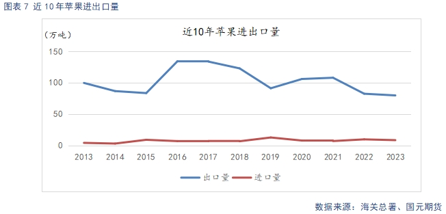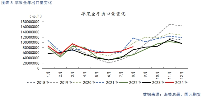 據(jù)海關(guān)總署數(shù)據(jù)顯示,2024年8月,出口量為8.3萬(wàn)噸,環(huán)比增長(zhǎng)26.3%,同比增長(zhǎng)31%。二三季度處于季節(jié)出口淡季,但今年果價(jià)下跌幅度較大,適合出口的貨源價(jià)格優(yōu)勢(shì)明顯,同比出現(xiàn)較大增幅,今年出口整體表現(xiàn)良好。不過(guò)鮮蘋果以內(nèi)需為主,在內(nèi)需低迷的背景下,出口對(duì)價(jià)格有一定支撐,卻難以扭轉(zhuǎn)供強(qiáng)需弱的整體格局。