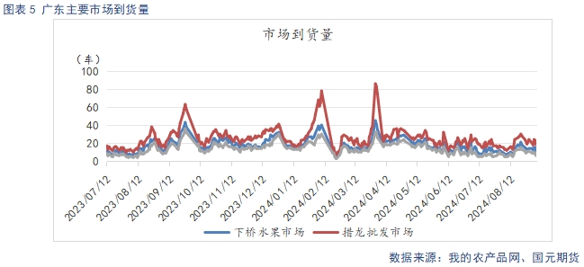 截止9月30日,庫(kù)存洛川70#半商品均價(jià)4元/斤,價(jià)格與上周環(huán)比持平。庫(kù)存棲霞80#一二級(jí)均價(jià)3.5元/斤,價(jià)格與上周環(huán)比持平。國(guó)慶期間,新果陸續(xù)上市,不過(guò)目前交易量較小,成交價(jià)差異較大,目前洛川新季70#半商品3.0-3.5元/斤,較去年同期下降0.5-1元/斤。棲霞80#一二級(jí)片紅2.5-3元/斤,較去年同期低1元左右。截止9月30日,廣東主要蘋果批發(fā)市場(chǎng)日均到貨18車,較上周增長(zhǎng)3車。臨近國(guó)慶,市場(chǎng)到貨量有所增長(zhǎng),不過(guò)舊果庫(kù)存余貨不多,新果還未上量,增長(zhǎng)幅度有限。國(guó)慶后,隨著新果上市量逐漸增大,到貨量將出現(xiàn)增長(zhǎng)。
