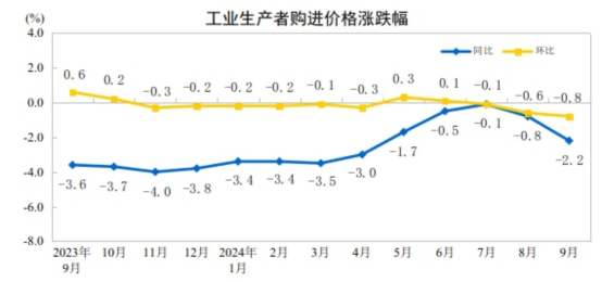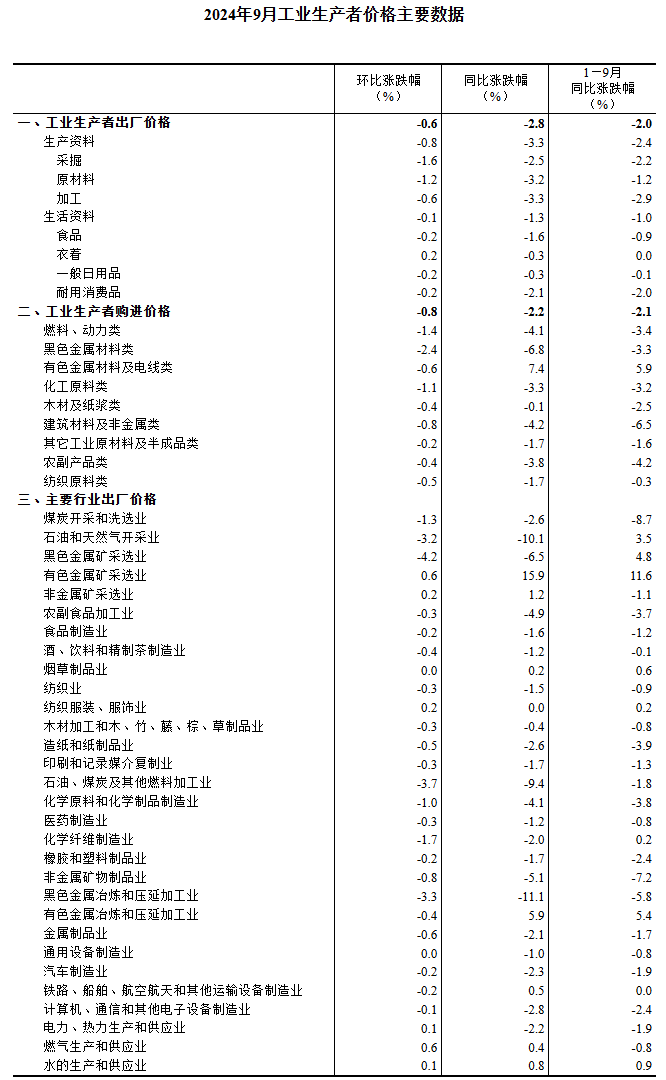 2024年9月份,全國工業(yè)生產(chǎn)者出廠價格同比下降2.8%,環(huán)比下降0.6%;工業(yè)生產(chǎn)者購進價格同比下降2.2%,環(huán)比下降0.8%。1—9月平均,工業(yè)生產(chǎn)者出廠價格比上年同期下降2.0%,工業(yè)生產(chǎn)者購進價格下降2.1%。