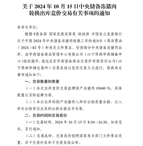 同日,華儲(chǔ)網(wǎng)還發(fā)布關(guān)于2024年10月16日中央儲(chǔ)備凍豬肉輪換收儲(chǔ)競(jìng)價(jià)交易有關(guān)事項(xiàng)的通知。根據(jù)通知,本次收儲(chǔ)掛牌競(jìng)價(jià)交易19600噸,與出庫(kù)數(shù)量相同。