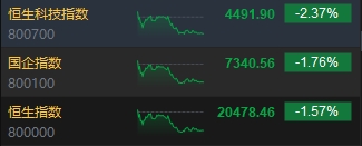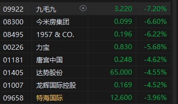 10月21日消息,今日港股三大指數(shù)全天走低,截至收盤,恒生指數(shù)(20478.461, -325.65, -1.56%)跌%1.57,報(bào)20478.46點(diǎn),恒生科技指數(shù)(4491.9, -108.95, -2.37%)跌2.37%,國企指數(shù)跌1.76%。盤面上,科網(wǎng)股普跌,網(wǎng)易跌近4%,阿里巴巴、百度、京東、騰訊、美團(tuán)跌超2%;中醫(yī)藥概念股跌幅居前,中國中藥(2.48, -1.34, -35.08%)跌超35%;餐飲股紛紛下跌,九毛九(3.22, -0.25, -7.21%)績后跌超7%;SaaS概念股走弱,邁富時(shí)跌超11%;黃金股逆勢上漲,中國黃金國際(37.15, 1.90, 5.39%)漲超5%。